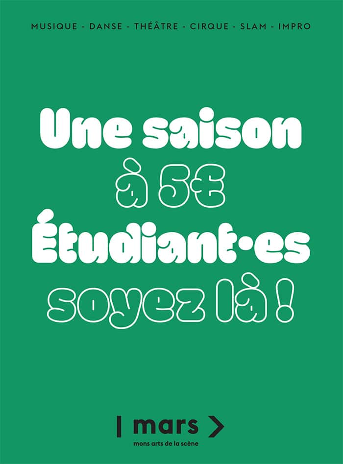 Bonne nouvelle : ta carte étudiant te donne droit au tarif exclusif de 5€ (au lieu de 18€) sur la quasi-totalité* de la programmation (spectacles et concerts sur la grille 18€).
