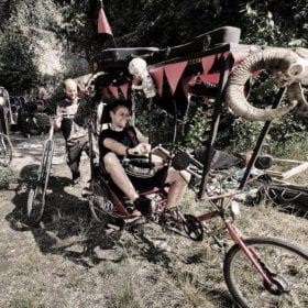 Huit musiciens fanfarons en convoi burlesque à pédales – la KermosZyclette – traversent...