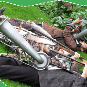 Un homme orchestre virtuose, un piano à queue sur un vélo accompagné d’un...